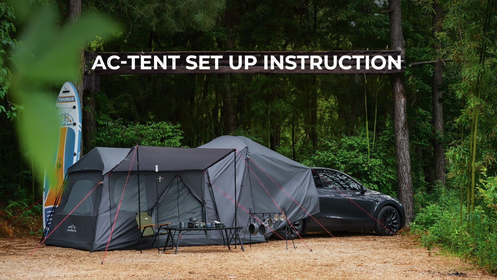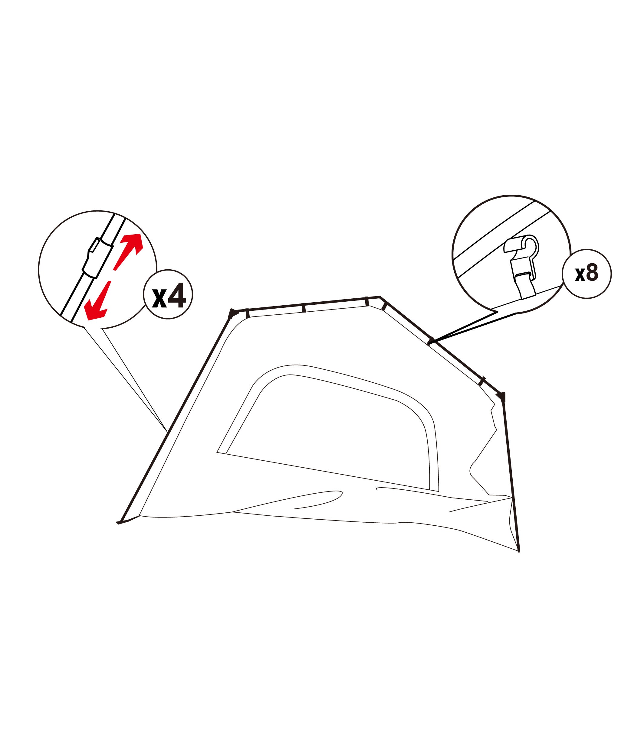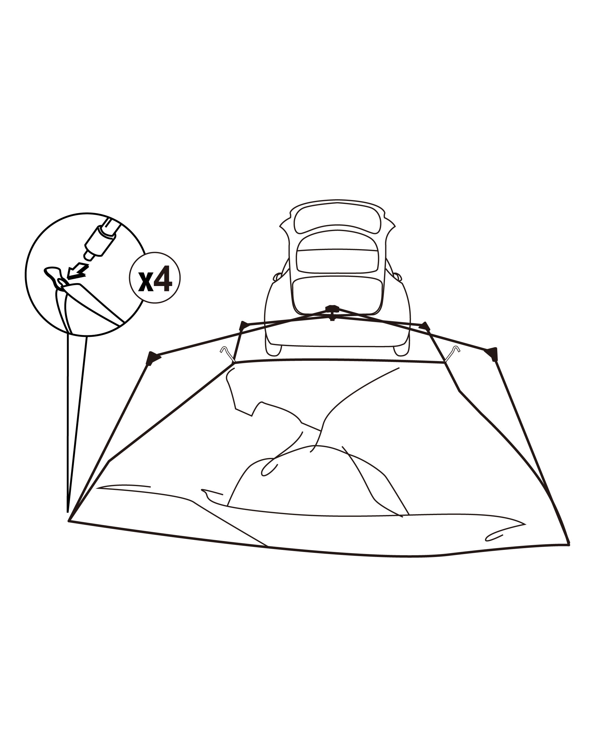 Attach the front hooks to the front pole, extend the car canopy, and secure the guy ropes.