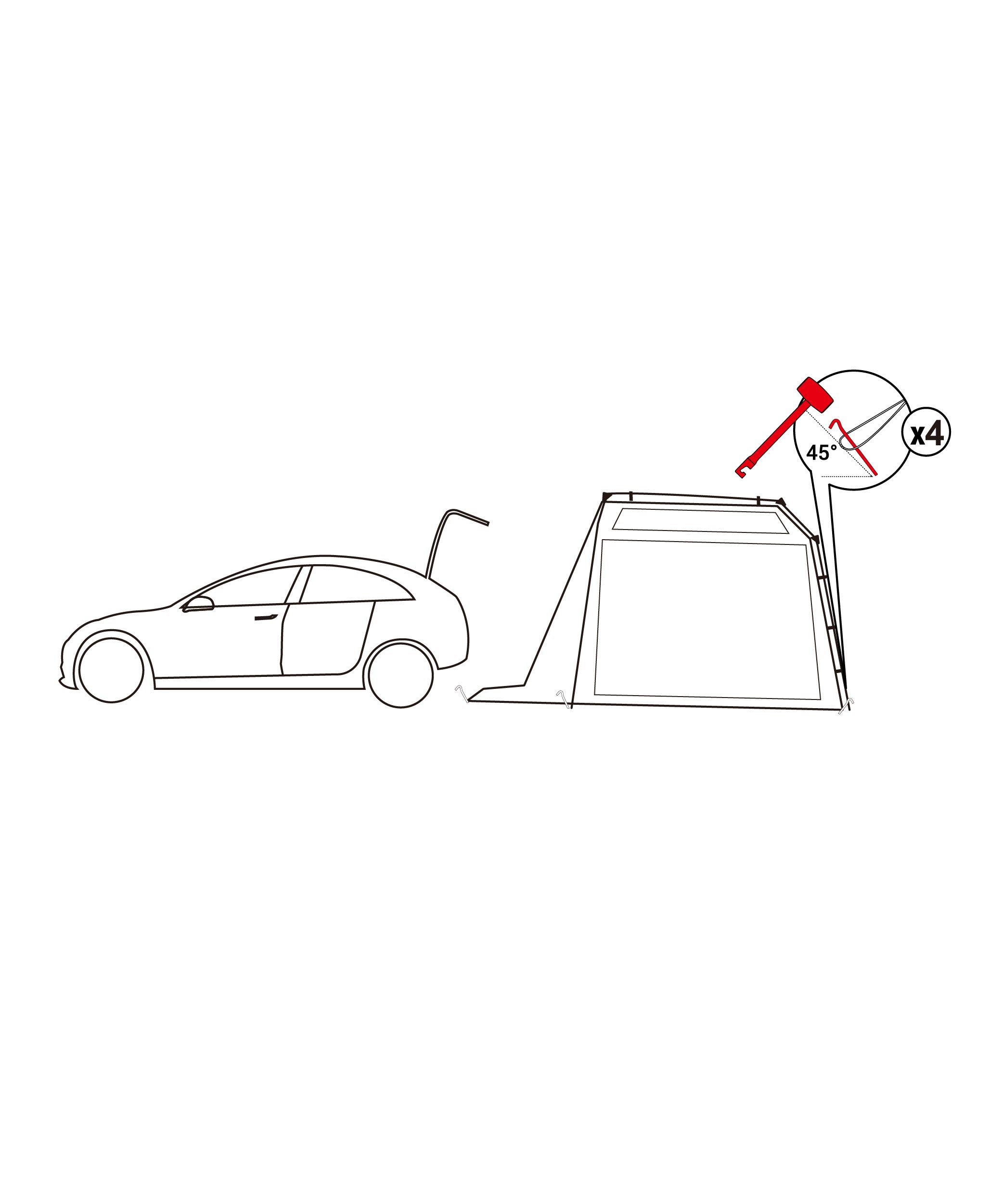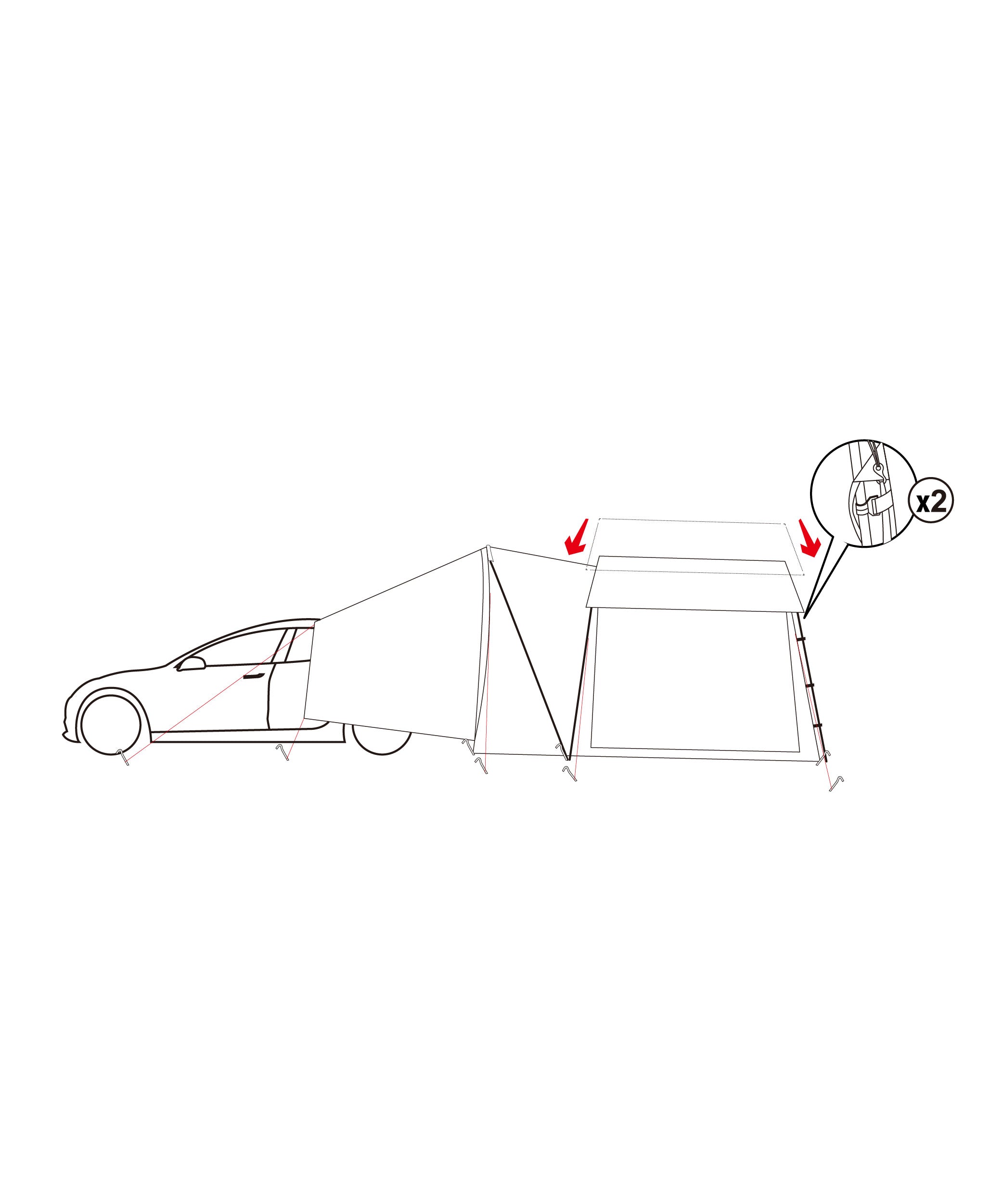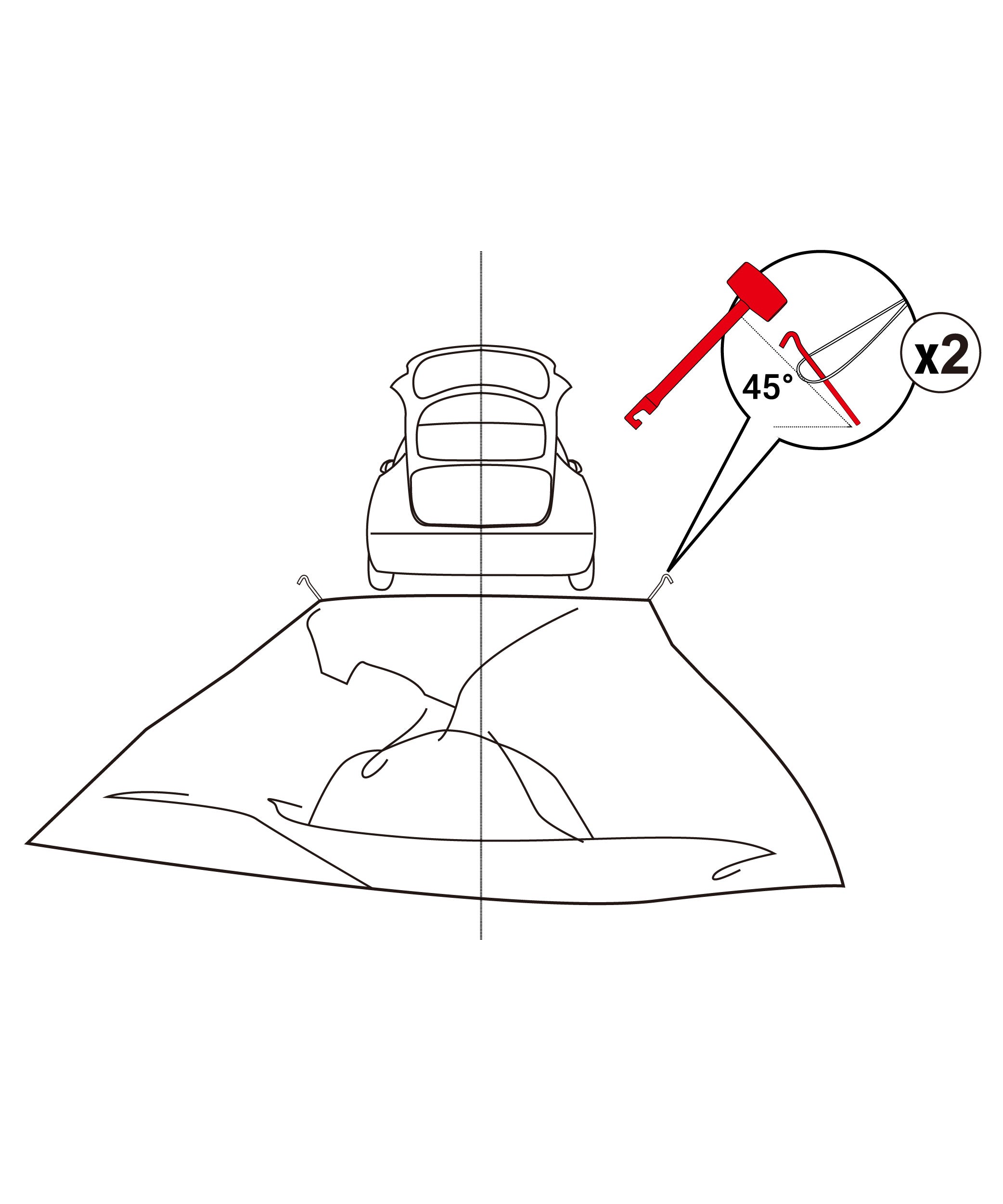 Align the center of the tent with the center of the car, and secure the front peg points beneath the tailgate.