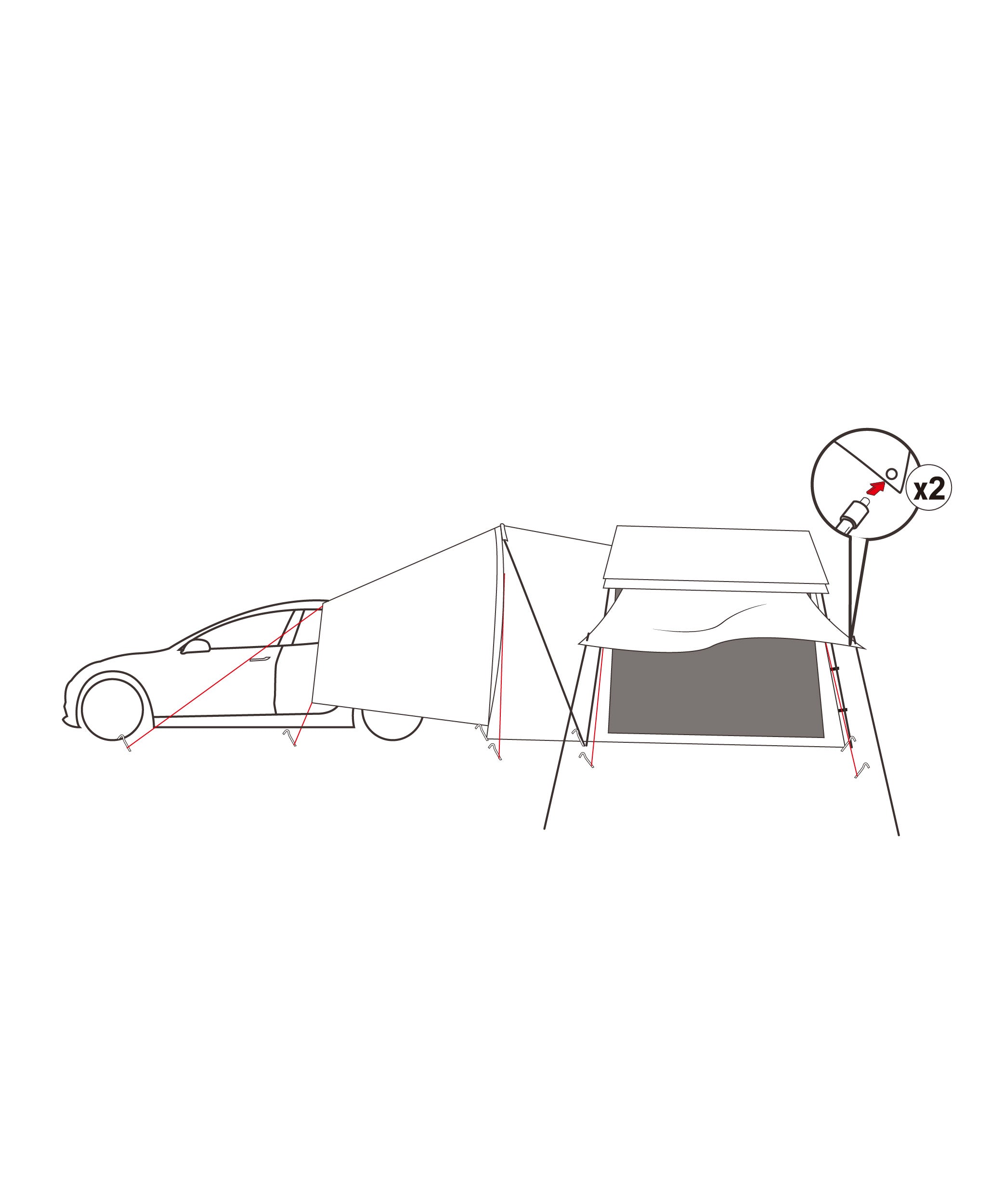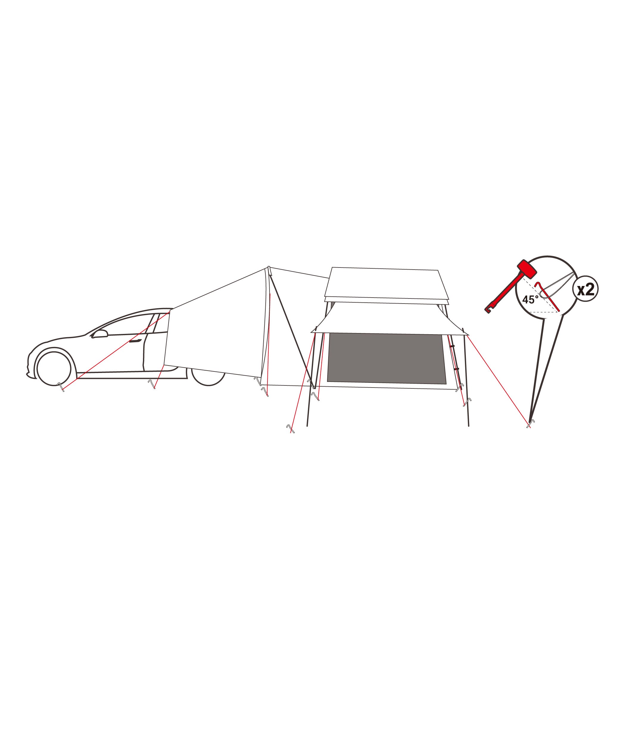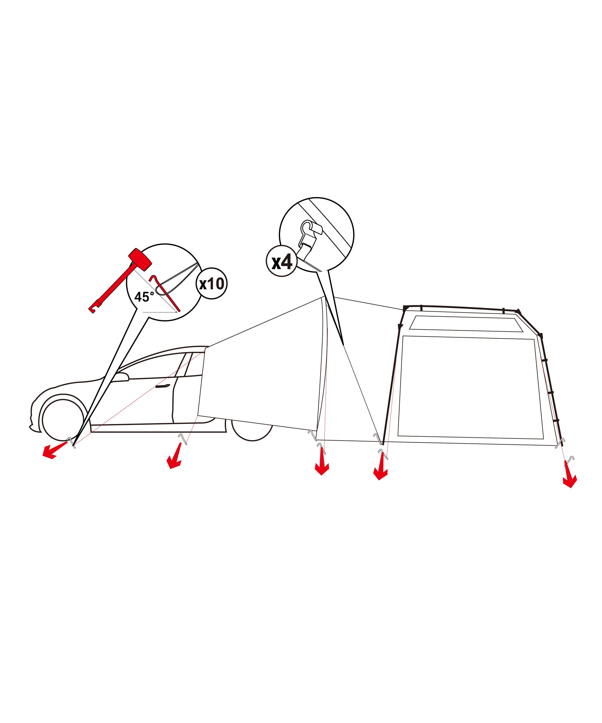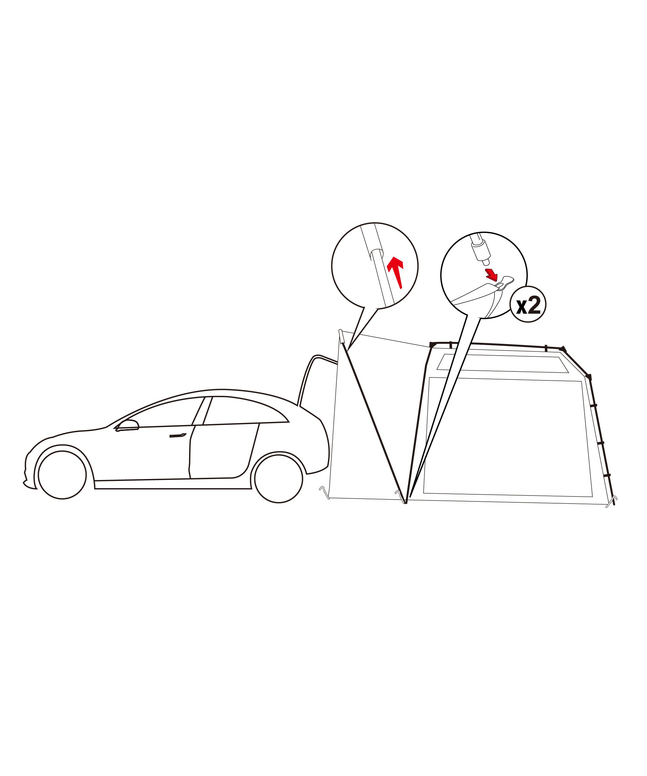 Align the center of the tent with the center of the car, and secure the front peg points beneath the tailgate.