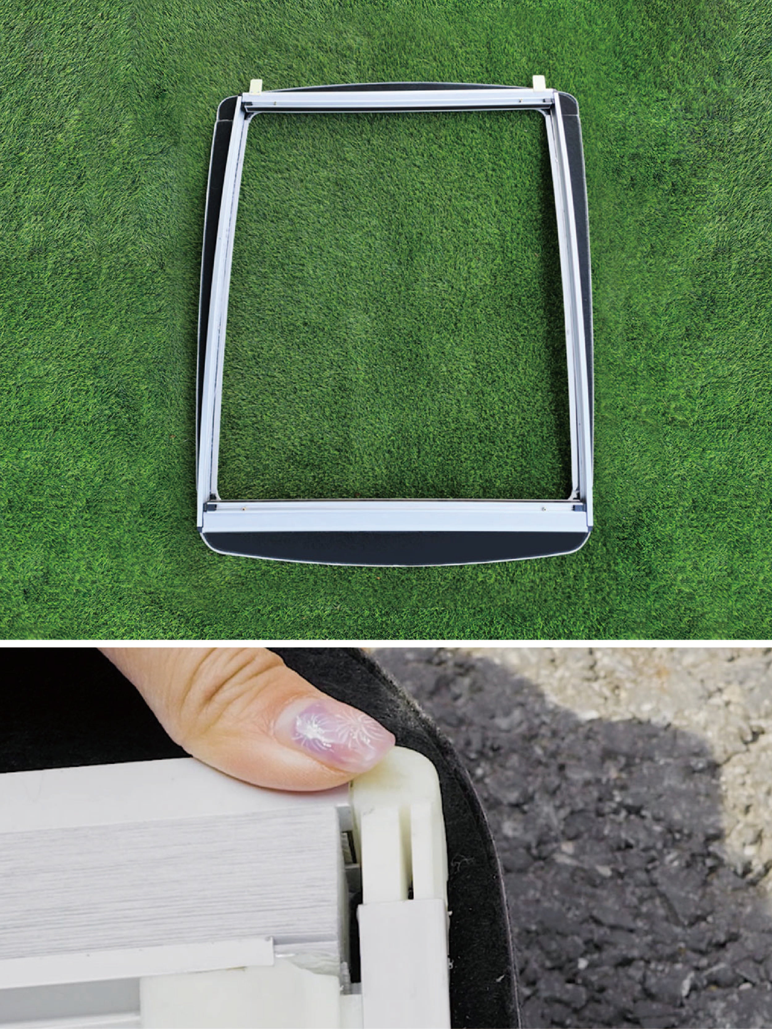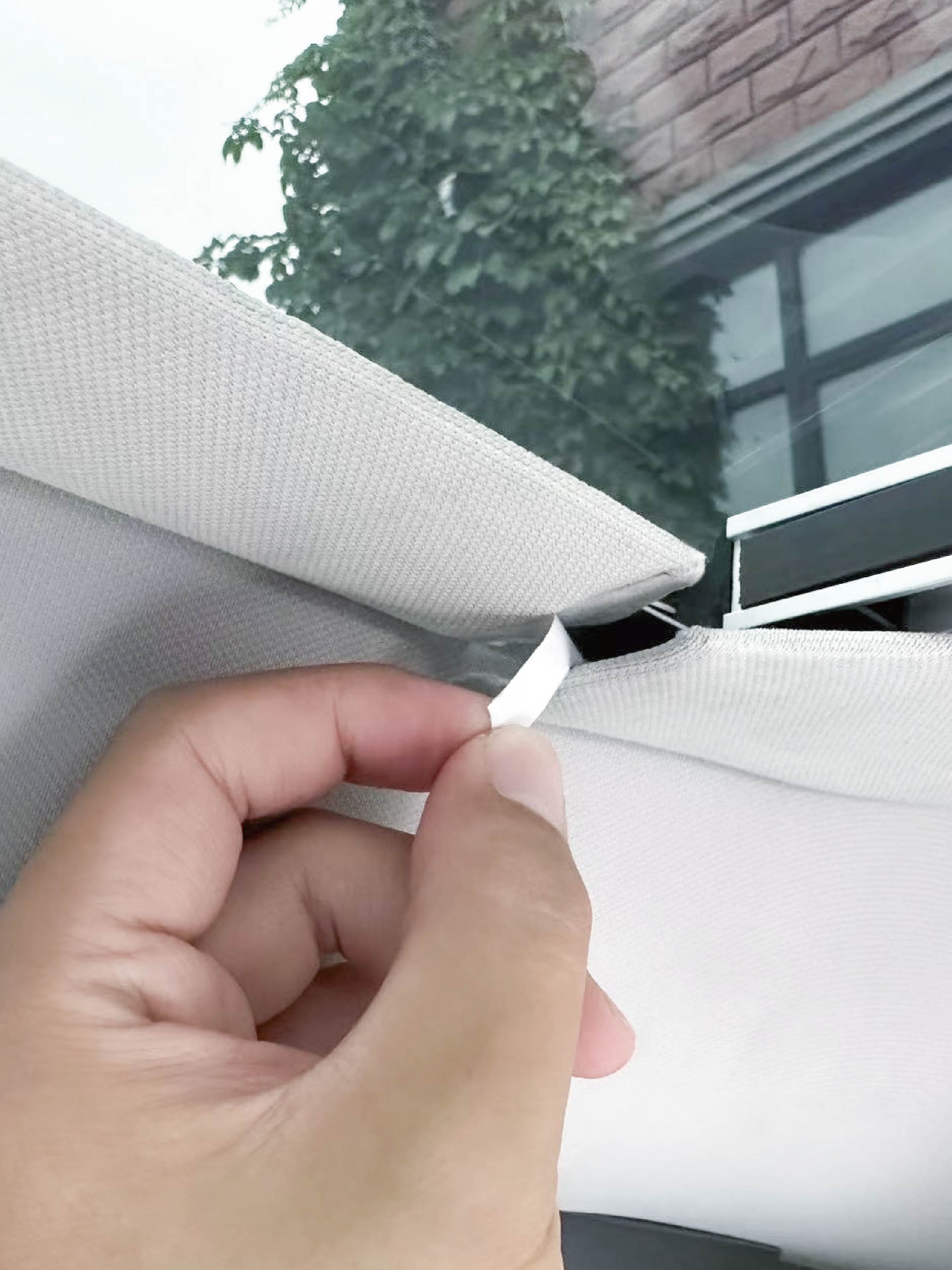After completing step 9, make sure sunshade opens and closes smoothly, then peel off the adhesive at the four-panel junctions. Hold it in place for a while to allow the adhesive to stick firmly.