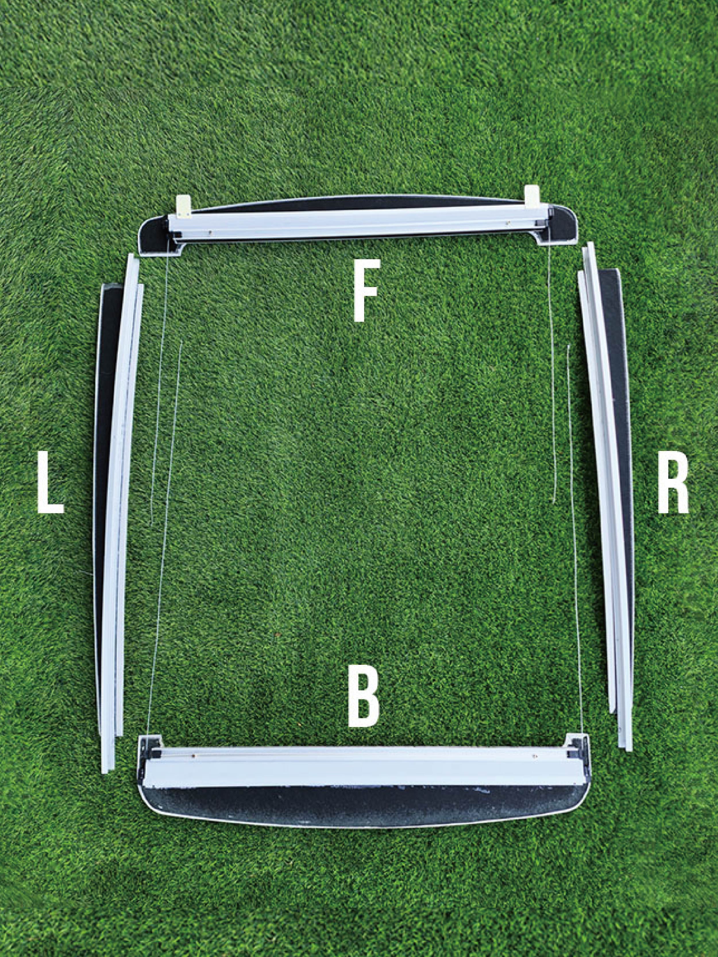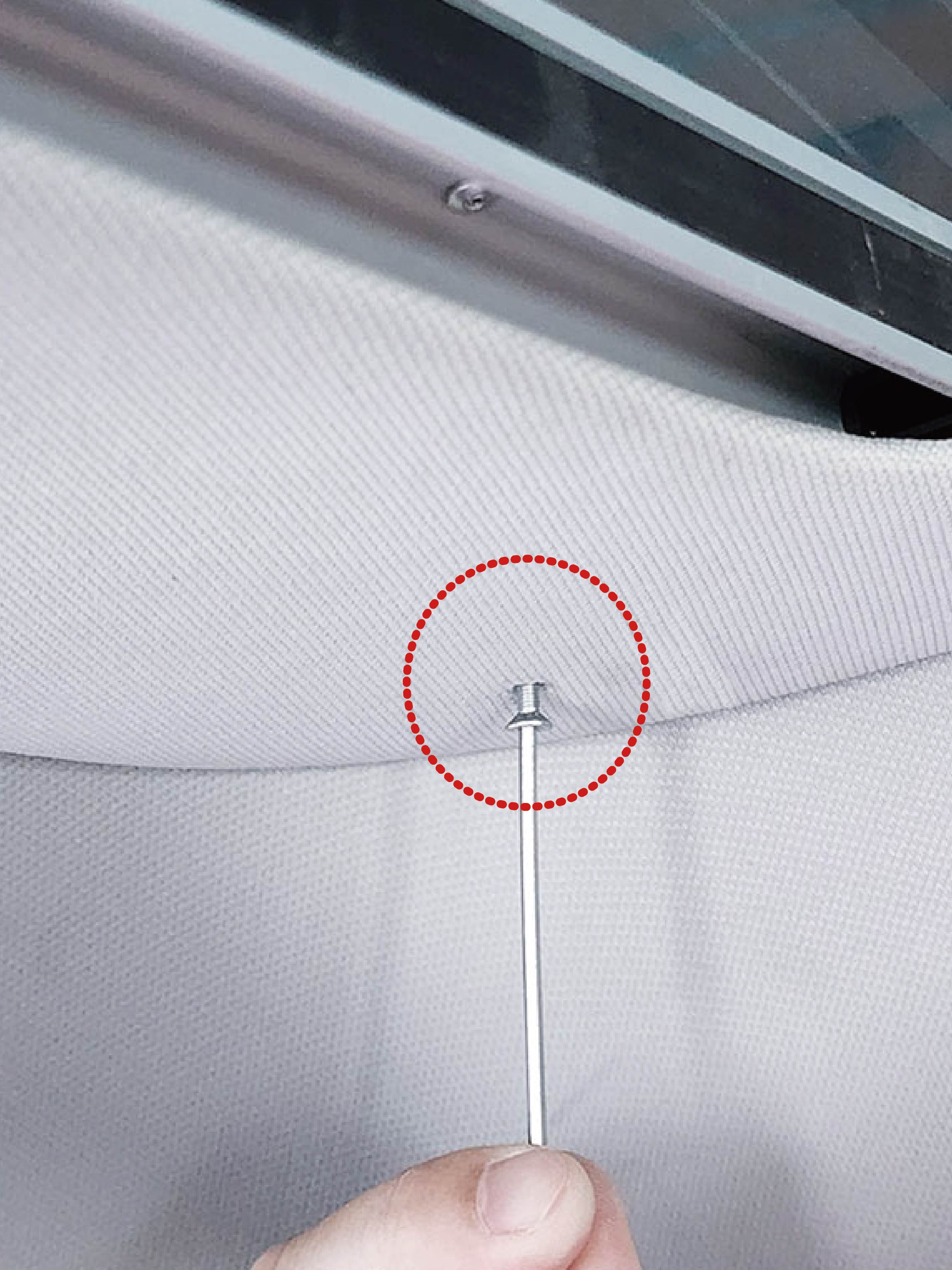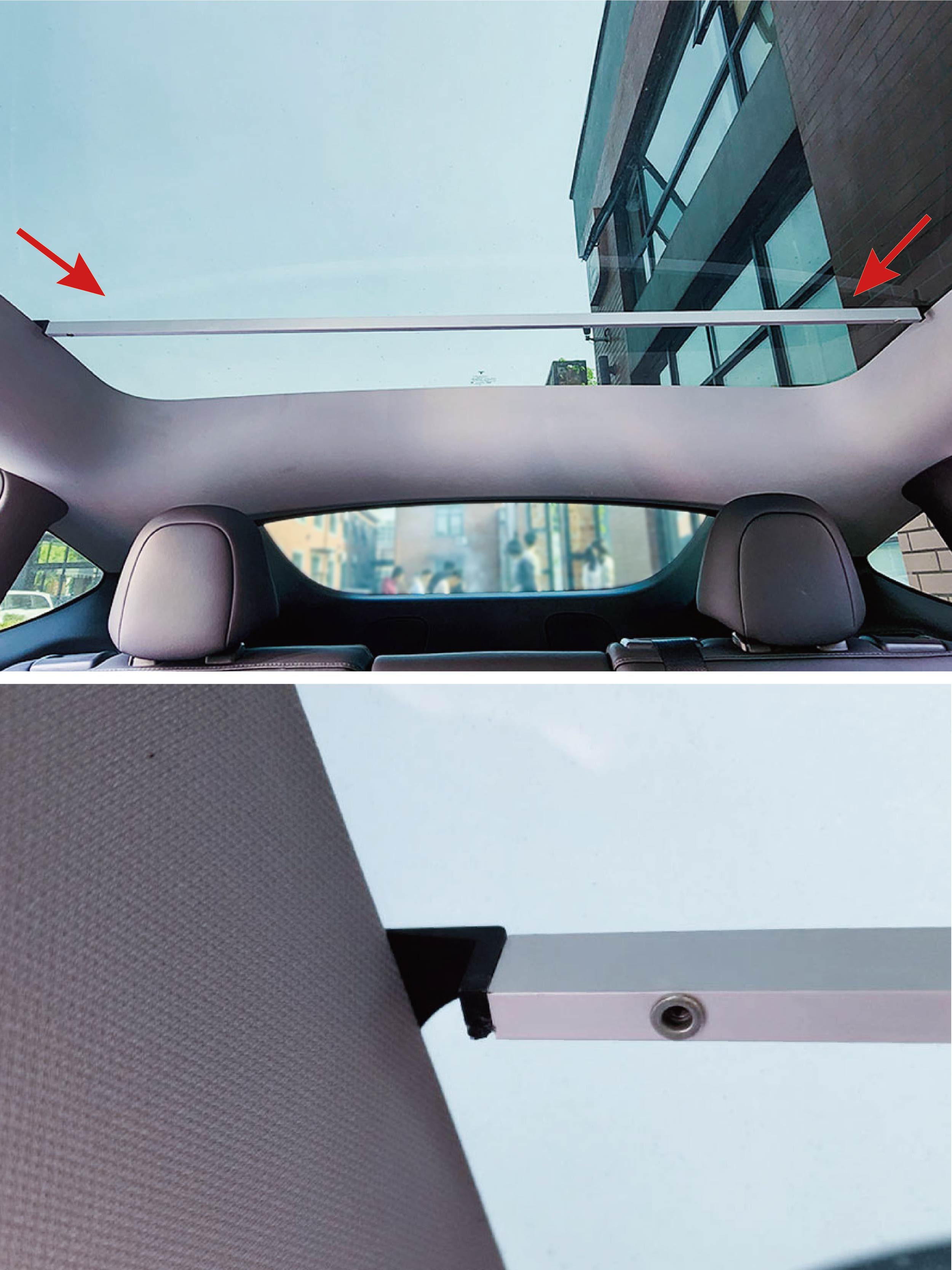 Enter the car with the aluminum rod, and insert the two ends of the rod to the car roof through the gap in the roof. Push the rod further towards the back of the car. Note: Make sure the direction of the mounting plate faces the back of the car, and the screw holes on the plate face downward.