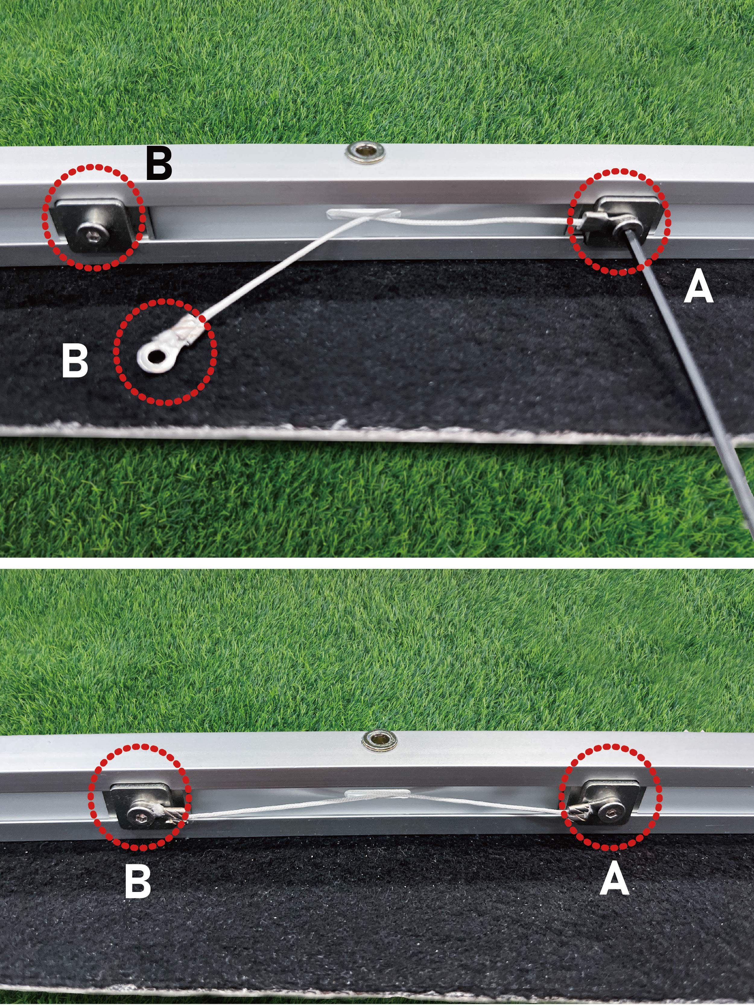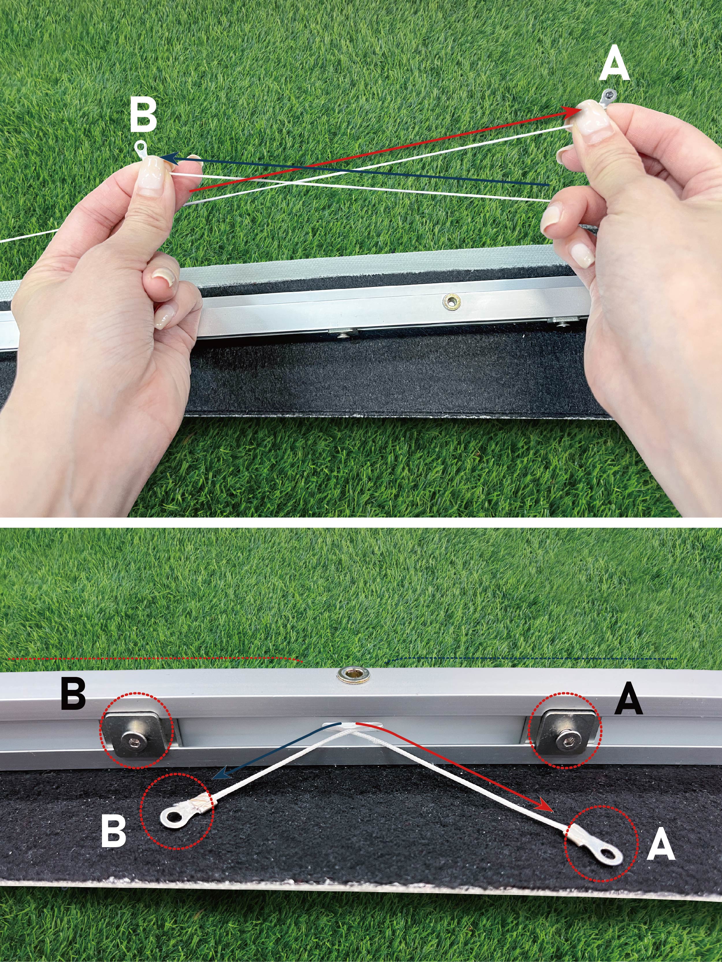 Unscrew the A screw (on the right), after threading the A rope over the screw, screw it back tightly; Unscrew the B screw (on the left), after threading the B rope over the screw, screw it back tightly. During this process, it may be a bit tight, so you may need to gently pull and adjust the rope. The rope has a slight elasticity, so don't worry about breaking it, but it should be in a taut state.Repeat these steps for the other side to finish assembling the frame.