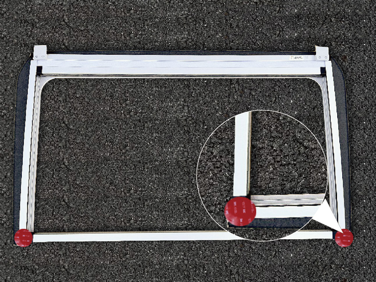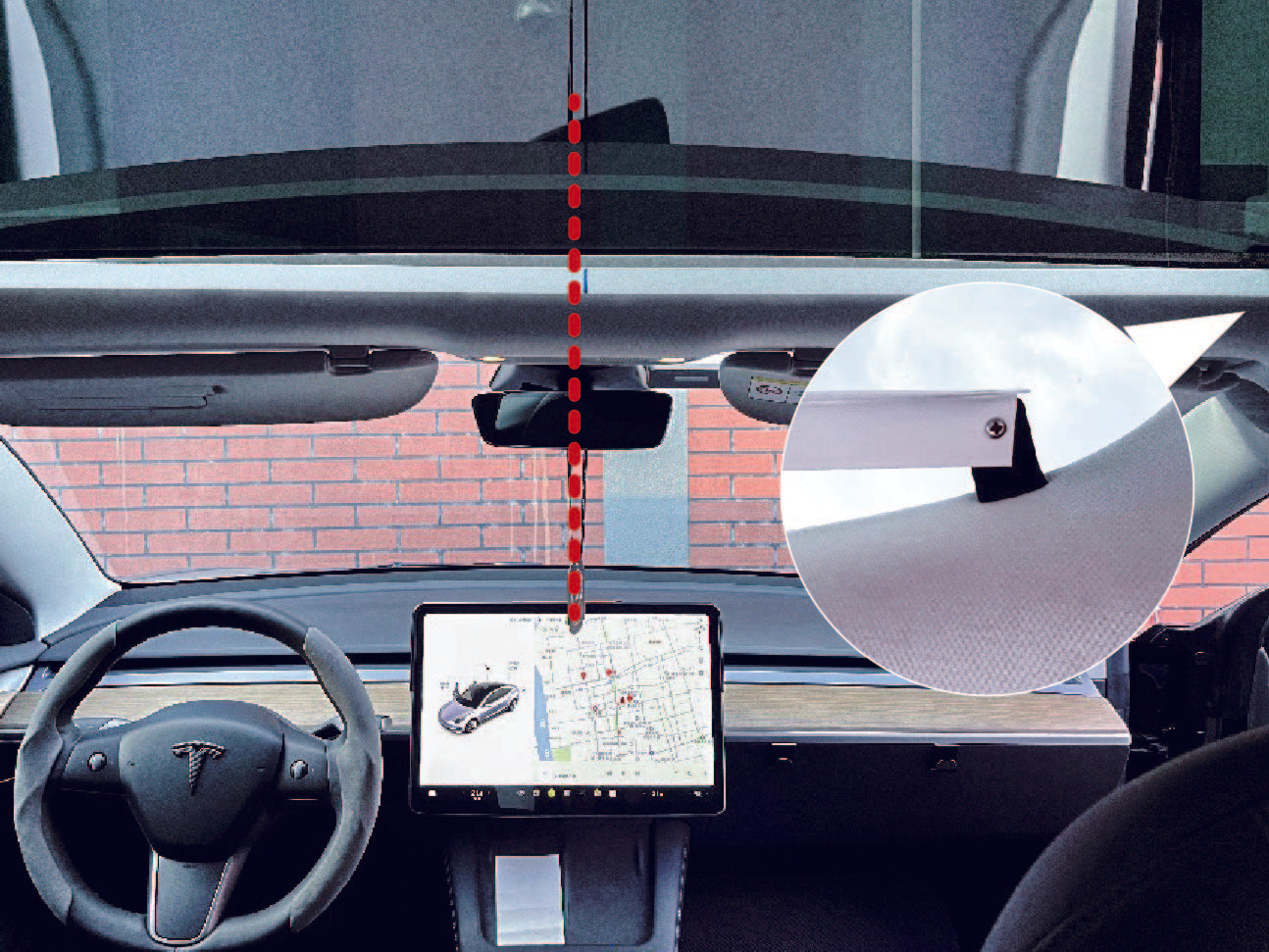Use clip locator to find location for both black front clips: make sure the mark in the middle aligns with the emergency light button. Insert both black clips onto the roof.